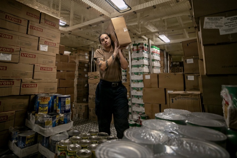 18日晚些时候,美国海军作战部长办公室又发布了几张照片,展示“林肯”号和“的黎波里”号上供应着热气腾腾的新鲜餐食和堆到天花板的物资。